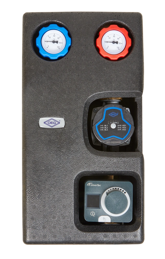 Pompgroep met hoogwaardige 3-weg mengklep, vaste-waarderegelaar met servomotor en efficiënte circulatiepomp. Constante temperatuur en minimaal warmteverlies.